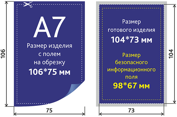 Размер листовки с припусками на обрез 106x75 мм (т.е. по 1 мм с каждого края);